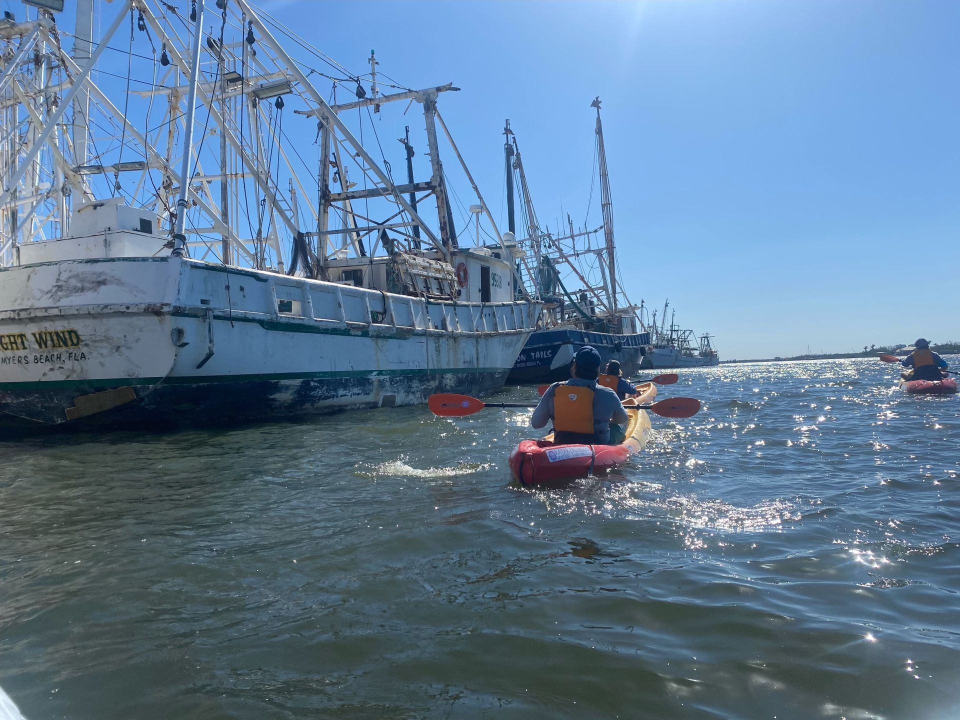 - Kayak Excursions - We very much enjoyed our guided eco kayak tour out of Pelican Bay. It was about three hours long, and our guide was very knowledgeable of the history and wildlife of the Fort Myers Beach area. We toured the bay, went around San Carlos Island, kayaked around the shrimp boats in the area, and went through mangroves. We even had some dolphins swimming alongside us!